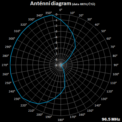 Parametry vysílače: Kiss Morava 96.5 FM - 1000W (30.0 dBW) vertical (D-diagram)