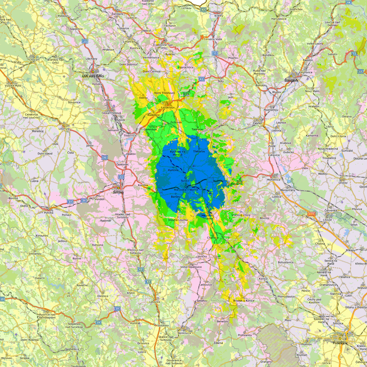 novinky je 100 watt. Přiložená mapka z výpočetního software RadioLab nastiňuje očekávané pokrytí.