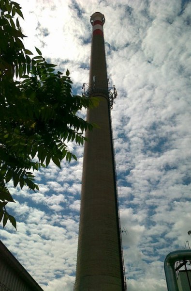Anténním systémem je jednoduchý vertikální dipól, doslova visící ve výšce cca 95m komínu,