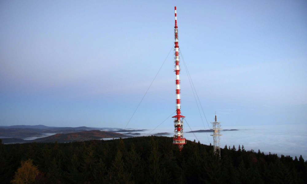 Pohled z Kleťi na České Budějovice pod inverzní oblačností (velký svítící flek uprostřed).