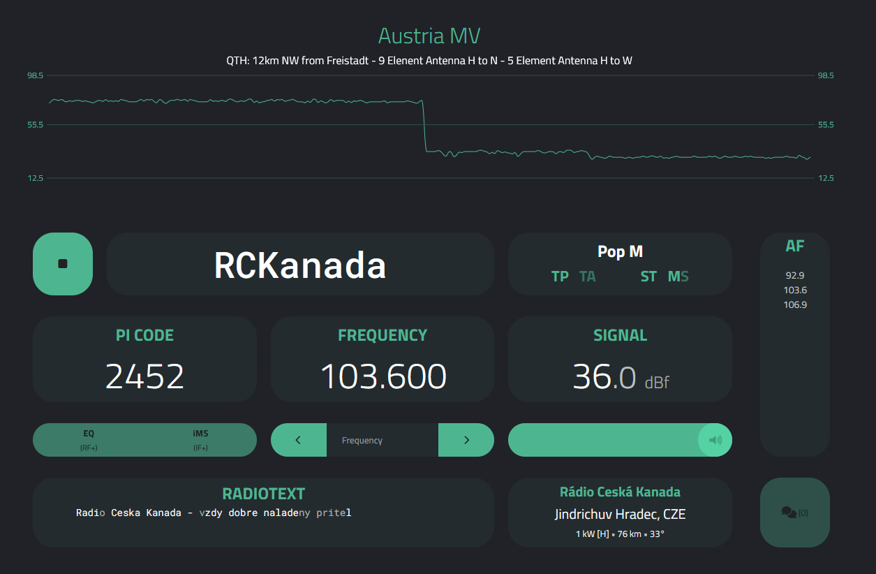 Rádio na dálku na rakousko českých hranicích pokud méně přesná mapa neklame. Na chvíli v PTY skočil i rock, nevím zda to byla záležitost Kanady či chycení jiného signálu.
