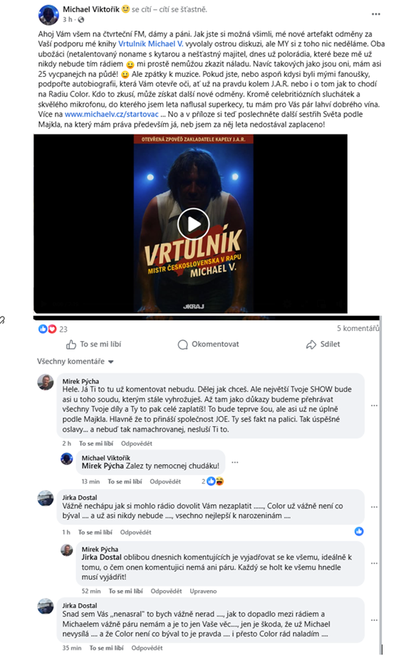 Z toho obrázku komunikace z Facebooku bych řekl, že se nerozešli (Majkl V. a COLOR rádio) úplně v dobrém. Nevím, kdo je „netalentovaný kytarista“. No každopádně, jsem si doteď myslel, že přerušení vysílání pořadu „Svět podle Majkla“ bylo způsobeno v pořadí druhou zmínkou v zápise RRTV, ale vypadá to i na nějaké finanční neshody. Víc to komentovat nebudu.