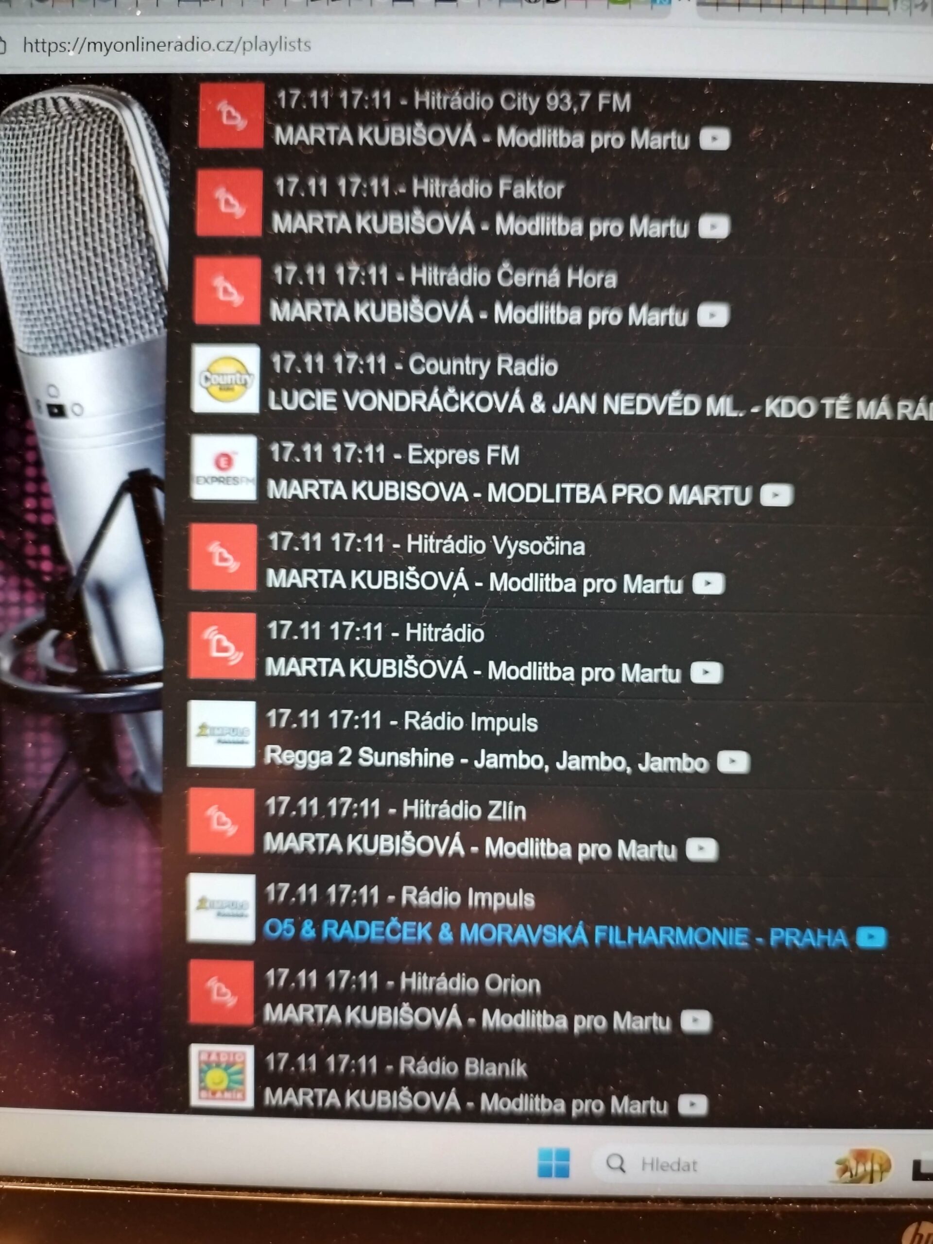 Kvůli aktivitám jsem dnes nezkoušel která rádia se sjednotila v 17:11, takže jsem neověřil proladenim různé verze Modlitby pro Martu ani nevím jaka verze pokud nějaká byla na Radiožurnálu. Největší koncentrace byla na Média Bohemia, kvůli tomu museli i po minutě utnout předchozí skladbu (Hitrádio); nejvíc mimo žánr to bylo na Expresu, na Čro HK o minutu později, takže se tomu tak nepodrizovali, dle tohoto okamžiku na Čro Dvojce se to z CZ hudbou (naštěstí zatím) nehroti a tak zřejmě na konci 11. minuty to rozpalili Queen – I want to break free , částečně tematické ne v naší řeči, na první pohled byl originální a národni Impuls neboť asi na chvíli tam zazněla skladba opět a Radeček s filharmonií – Praha, v zápětí však, a tady vědomě následoval zřejmě eurodance Jumbo, Jumbo Jumbo. Aspoň tak ten dnešní okamžik zachytilo myonline radio, web co se týče playlistů na principu radia.sk