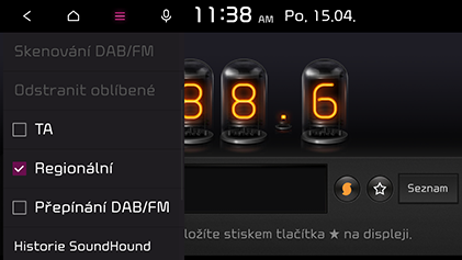 Zaškrtnutá, tedy aktivní funkce „Regionální“ dělá při příjmu FM pravý opak toho, co v DABu, protože potlačuje přelaďování FM na jiné mutace, přesněji řečeno reklamní odpojení při regionálním PI kódu. Při změně PI kódu na centrální kód přelaďování FM-FM znovu funguje.